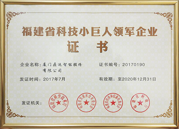 廈門鼎運(yùn)智能成功列入省科技小巨人領(lǐng)軍企業(yè)培育發(fā)展庫,并榮獲“福建省科技小巨人領(lǐng)軍企業(yè)”證書。