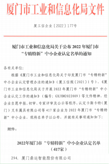 鼎運(yùn)智能榮獲廈門市“專精特新”中小企業(yè)稱號(hào)